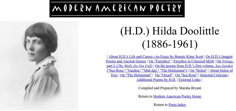 The Modern American Poetry site features an essay about H. D.?s (1886-1961 CE) life and career, selected criticism, and links to related sites.