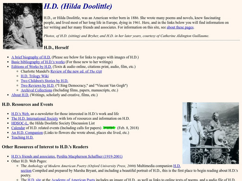 This site includes biographical and bibliographic information, e-texts of two children's stories by H.D., and links to other H.D. resources.