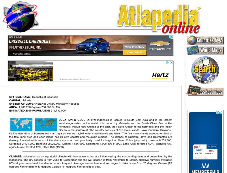 If you're doing a research paper on Indonesia, this is a great place to begin. Has information about the history, people, geography, climate, economy, and more. Click on the map image to get more details and an enlarged view.