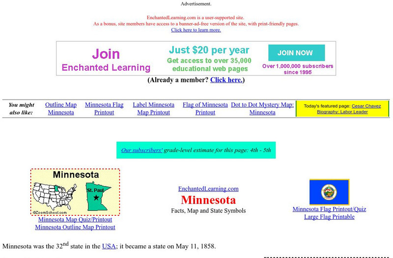 This site has a colorful display of information about Minnesota. It contains a map, pictures, a list of state symbols, and links to related information.