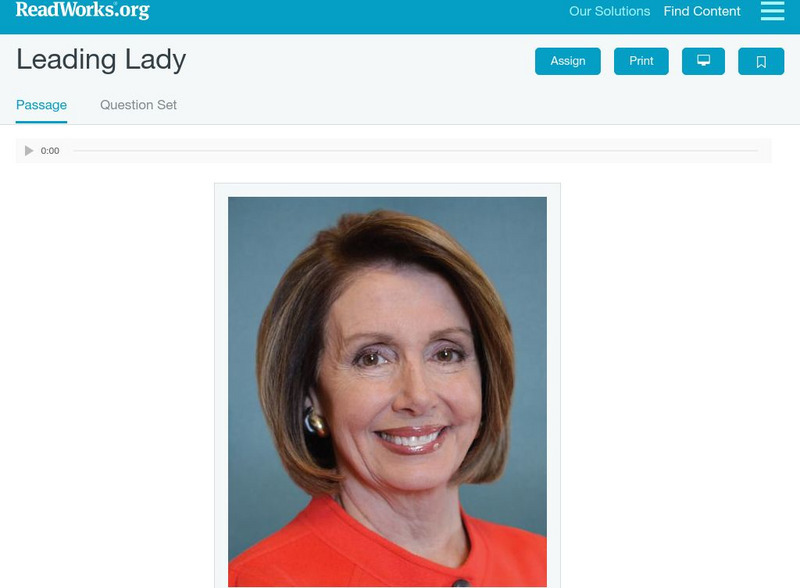 [Free Registration/Login Required] An informational text about Nancy Pelosi, the first female Speaker of the House. A question sheet is available to help students build skills in reading comprehension.