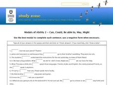 In this ESL modals worksheet, students type in the appropriate word to correctly complete sentences, choosing from: can, could, be able to, may or might, using negatives when necessary.