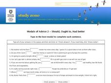 In this ESL modals learning exercise, students complete 10 multiple choice questions, choosing the phrase that best completes a sentence. A website reference for additional resources is given.