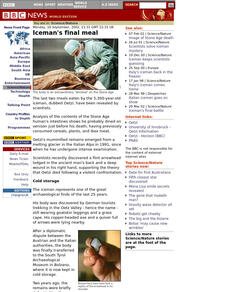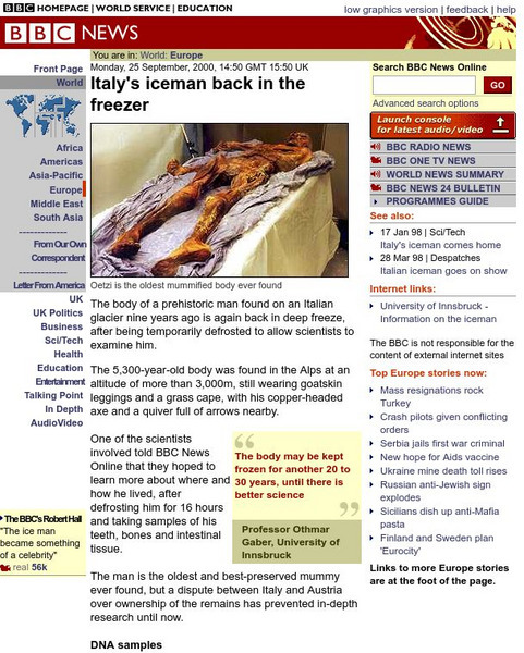 You may recall the 5,300 year-old male found frozen in a glacier back in 1991. Here is a site from the museum which is now his final resting place. Students can see the actual 'mummy' and pictures depicting what he might have looked like...