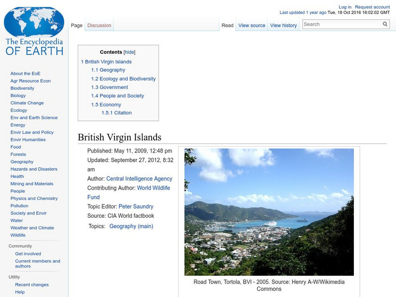 The Encyclopedia of Earth provides an overview of British Virgin Islands (United Kingdom), including its geography, natural resources, history, government, economy, and much more. Maps and images are also included, along with sources...
