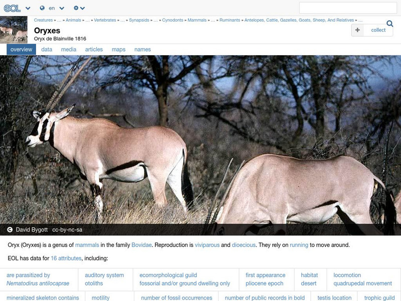 The Encyclopedia of Life presents this in-depth overview of Oryxes (Oryx), including their habitats, size, conservation status, and much more. Images of this genus and maps of its global distribution can also be found here.
