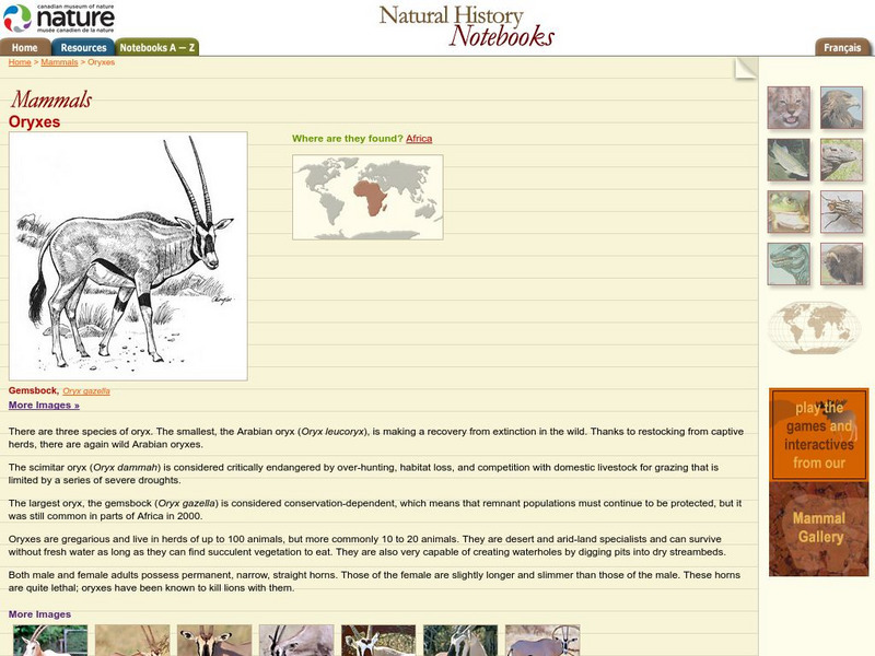 Get to know the Oryxes.. colored photos, description, life cycle, map of habitat, food. Only the basic details of this African animal are given, making the site perfect for younger researchers.