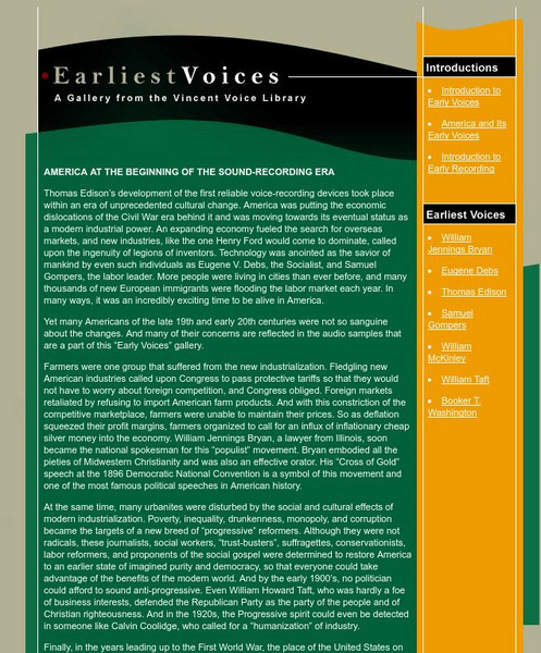 This site addresses the advent of the voice recording. The introduction talks about the country at the time of this invention, the feelings of people on the topic, and early recording itself. Included are voice recordings of such...
