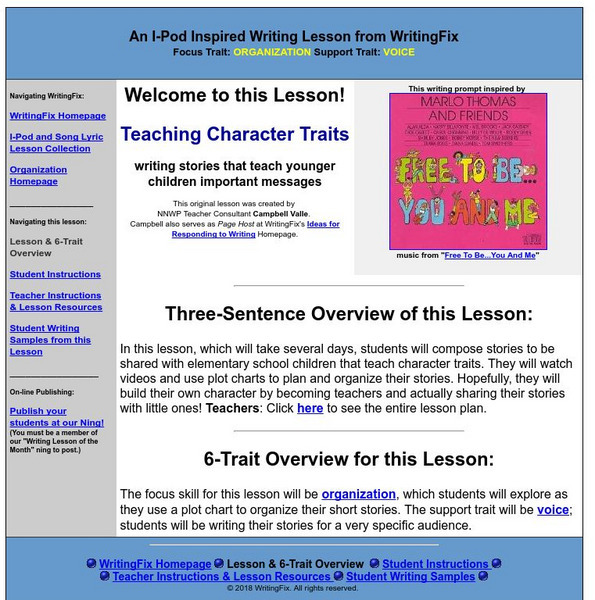 Inspired by the music "Free to Be. . . You and Me" by Marlo Thomas, this lesson, which will take several days, asks students to compose stories that teach character traits that will be shared with elementary school children. They will...