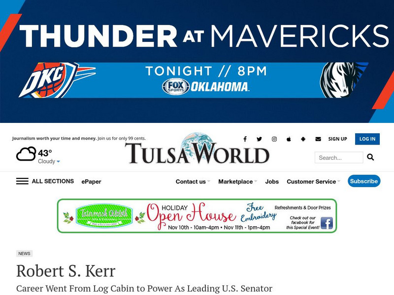 This article described the life and political career of the Oklahoma senator, including his political support of President John F. Kennedy.