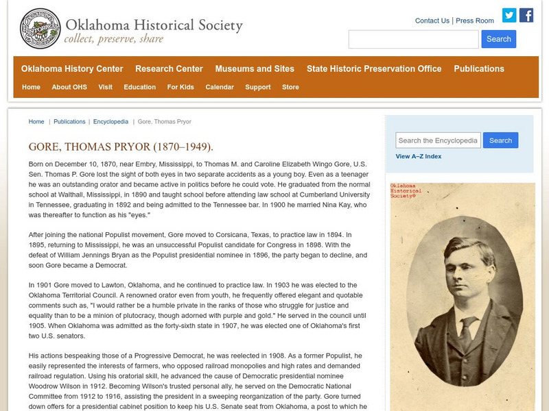 Learn about the personal life and career of Oklahoma senator Thomas Gore. Includes a discussion of his blindness and involvement in the Populist movement.