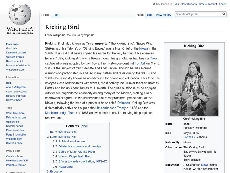 This in-depth biography discusses the life of Kiowa peace chief Chief Kicking Bird of Oklahoma. Learn about his work to prevent acts of war and create a peaceful relationship between Native Americans and white settlers.