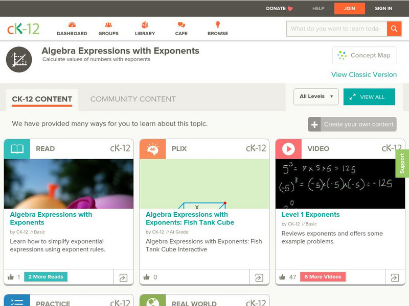 [Free Registration/Login may be required to access all resource tools.] In this lesson students find the value of algebraic expressions that contain exponents. Students can watch a video tutorial, explore guided notes and attempt...