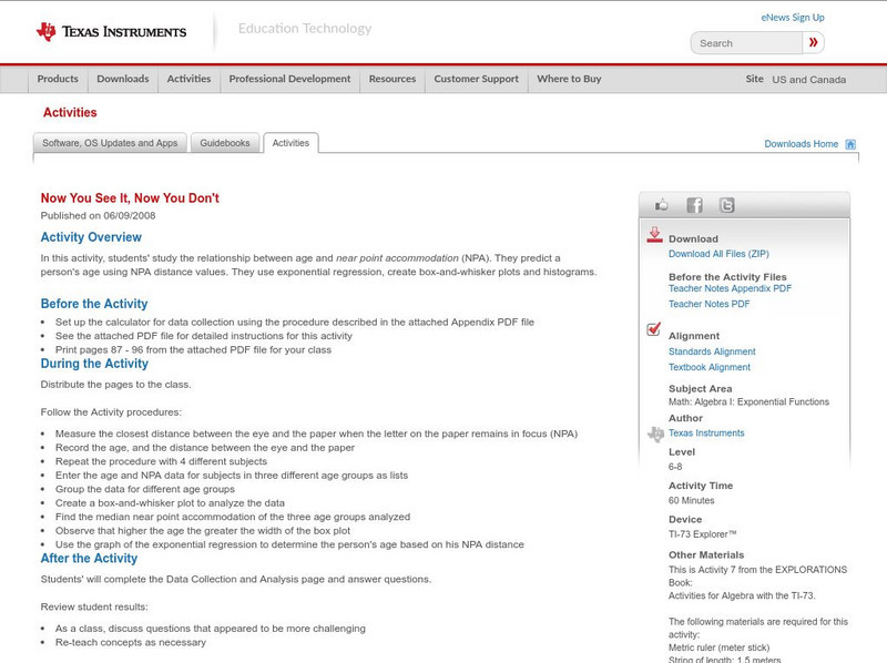 In this activity, students study the relationship between age and near point accommodation (NPA). They predict a person's age using NPA distance values. They use exponential regression, create box-and-whisker plots and histograms.