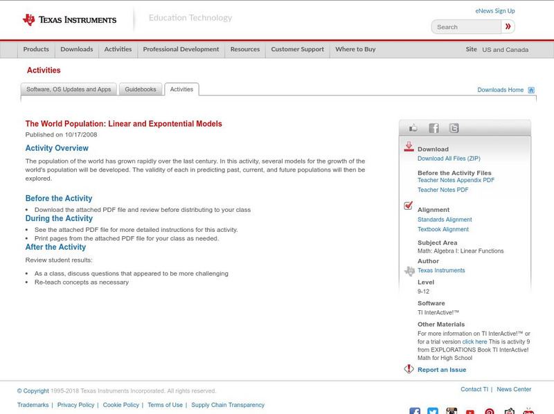 The population of the world has grown rapidly over the last century. In this activity, several models for the growth of the world's population will be developed. The validity of each in predicting past, current, and future populations...