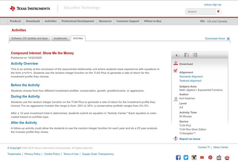 This is an activity at the conclusion of the exponential relationship unit where students have experience with equations in the form y=a*b^x. Students use the random integer function on theTI-83 Plus to generate a rate of return for the...