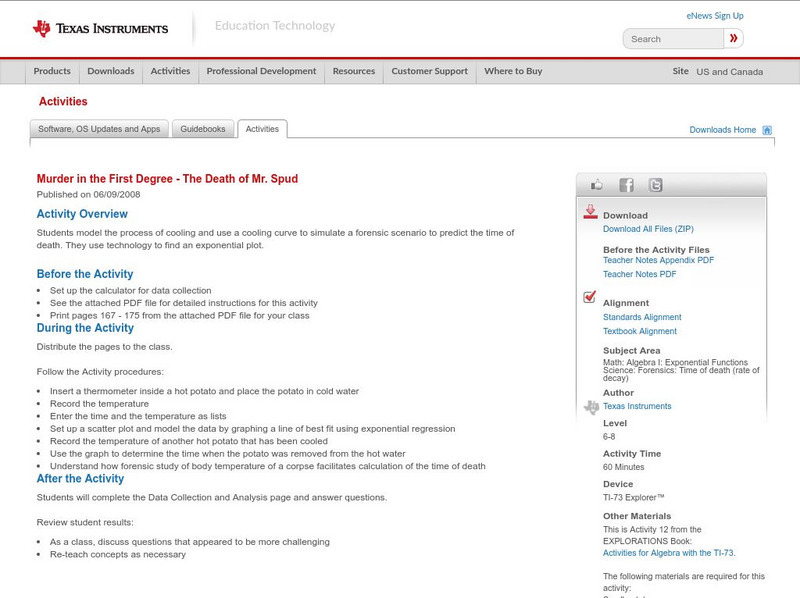 Students model the process of cooling and use a cooling curve to simulate a forensic scenario to predict the time of death. They use technology to find an exponential plot.