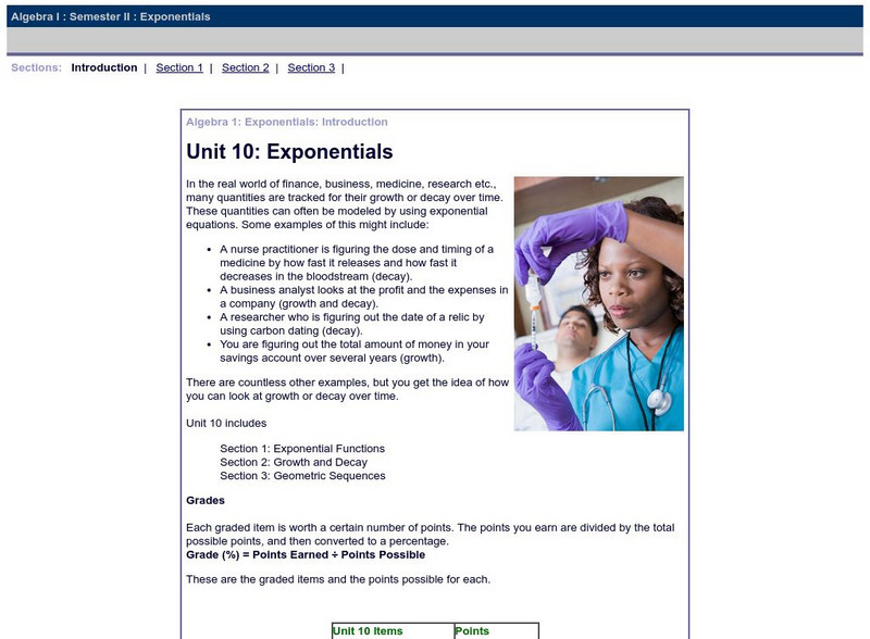 A learning module through which students learn about exponentials including exponential functions, growth and decay, and geometric sequences.
