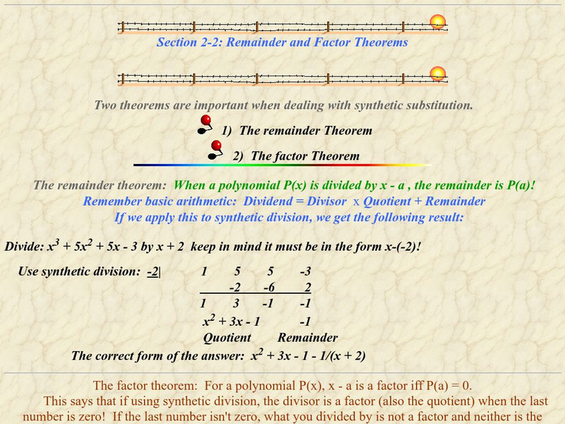 This site from the Richland Community College contains information on long and synthetic division, the remainder theorem and the factor theorem.