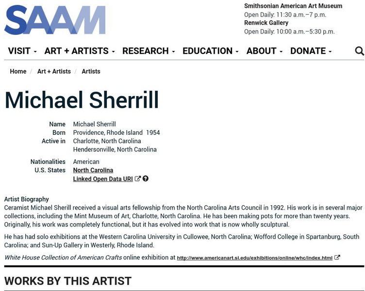 As part of the Smithsonian Art Museum's database of artists, Michael Sherrill is described here along with information on his contributions to art through his sculptured works of pottery including a collection of pots.