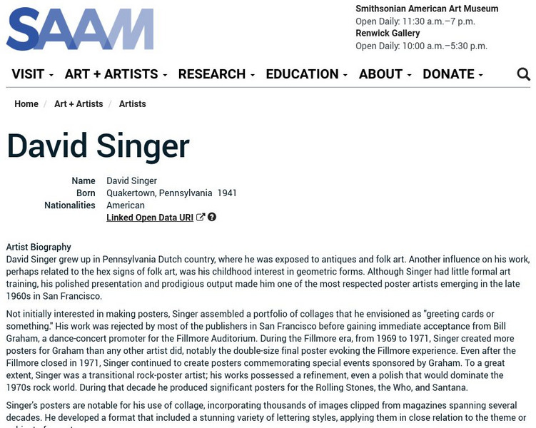 As part of the Smithsonian Art Museum's database of artists, David Singer is described here along with information on his contributions to art through his posters and poster design.