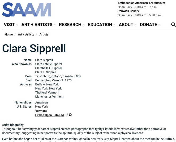 As part of the Smithsonian Art Museum's database of artists, Clara Sipprell is described here along with information on her contributions to art through photography.