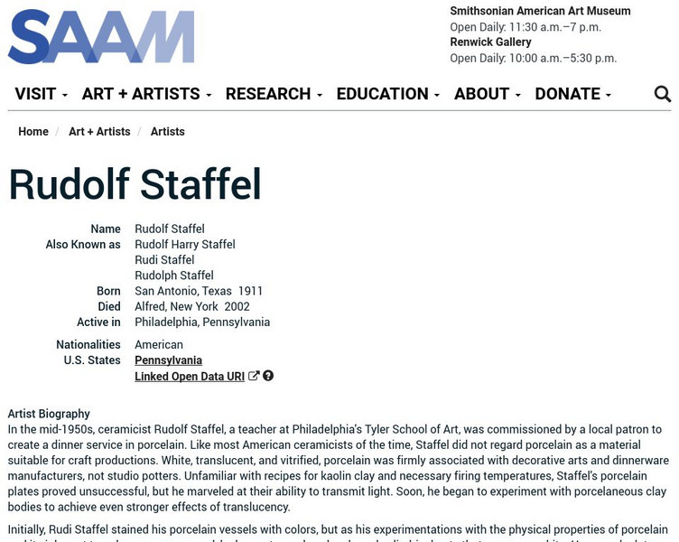 As part of the Smithsonian Art Museum's database of artists, Rudolf Staffel is described here along with information on his contributions to art through his work as a ceramicist.