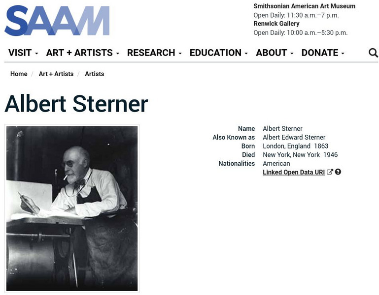 As part of the Smithsonian Art Museum's database of artists, Albert Sterner is described here along with information on his contributions to art through his portrait paintings, his printmaking, and his illustrations.
