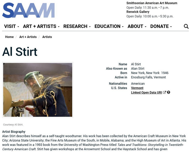 As part of the Smithsonian Art Museum's database of artists, Al Stirt is described here along with information on his contributions to art through his work as a woodturner.