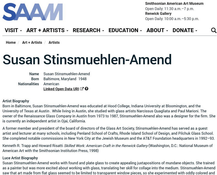 As part of the Smithsonian Art Museum's database of artists, Susan Stinsmuehlen-Amend is described here along with information on her contributions to art through her work with glass.