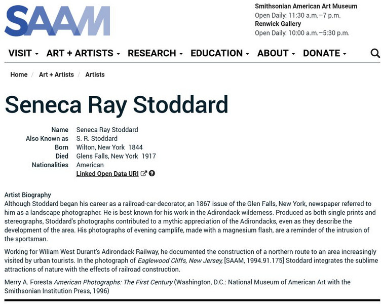 As part of the Smithsonian Art Museum's database of artists, Seneca Ray Stoddard is described here along with information on his contributions to art through photography.