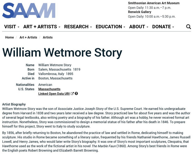 As part of the Smithsonian Art Museum's database of artists, William Wetmore Story is described here along with information on his contributions to art through sculpture.