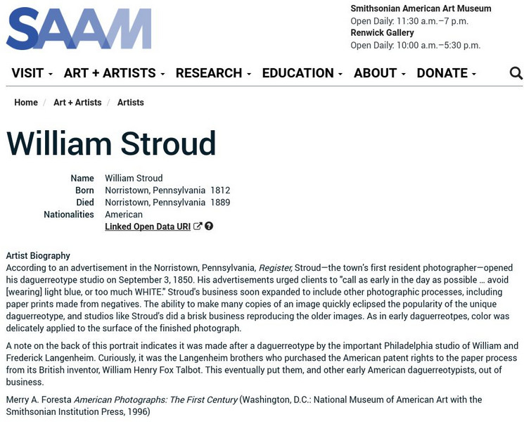 As part of the Smithsonian Art Museum's database of artists, William Stroud is described here along with information on his contributions to art through photography, and his work with daguerreotypes.