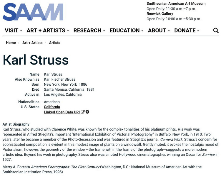 As part of the Smithsonian Art Museum's database of artists, Karl Struss is described here along with information on his contributions to art through his work with photography.