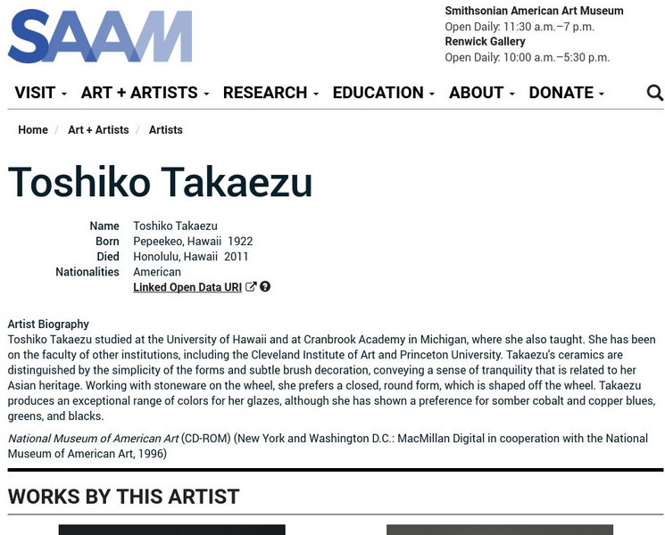 As part of the Smithsonian Art Museum's database of artists, Toshiko Takaezu is described here along with information on her contributions to art through her colorful glazes for her closed, round forms.