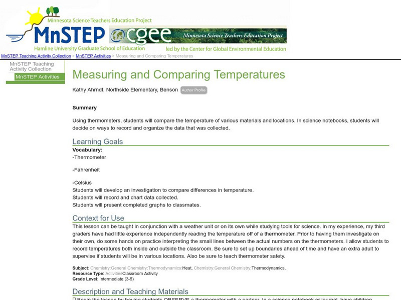 Using thermometers, students will compare differences in the temperature of various materials and locations. They will record and chart the data that was collected and present the graphs to their classmates.
