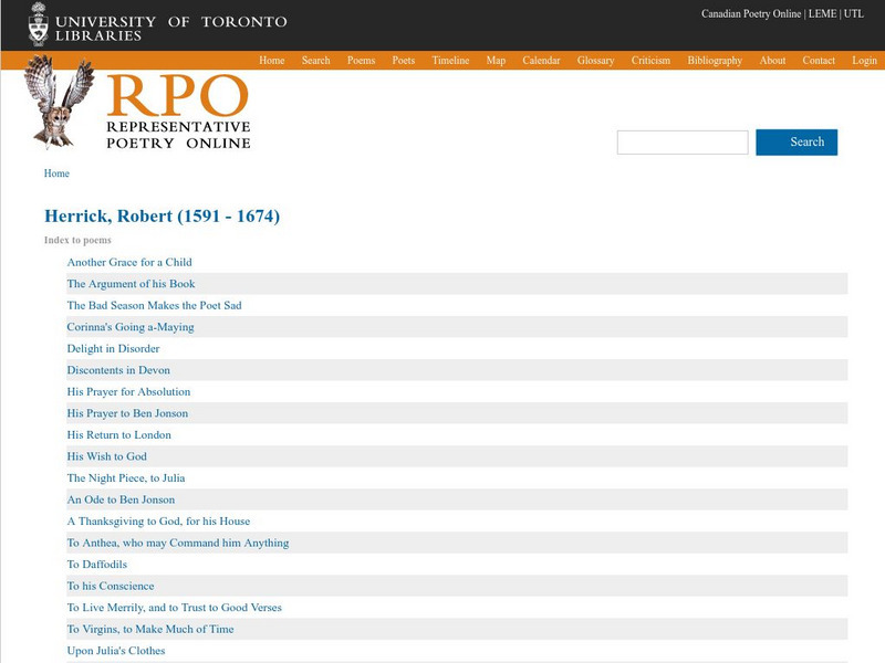 Links to 23 of Robert Herrrick's best loved poems, which can be read on-line. Some explanatory notes are included, as well as brief biographical information.