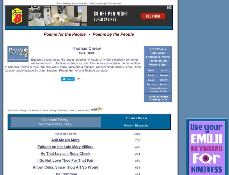 This site includes a short introduction to Thomas Carew and a biographical sketch of the poet. Also included are links to the text of several of Carew's poems.