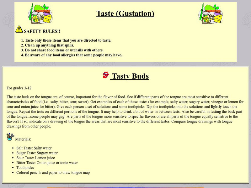 This site has an directions for an exercise called "Tasty activities." Tasty Buds is just the first of many cool activities exploring one of the five senses. The grade levels for the activities vary so keep searching for your best fit.