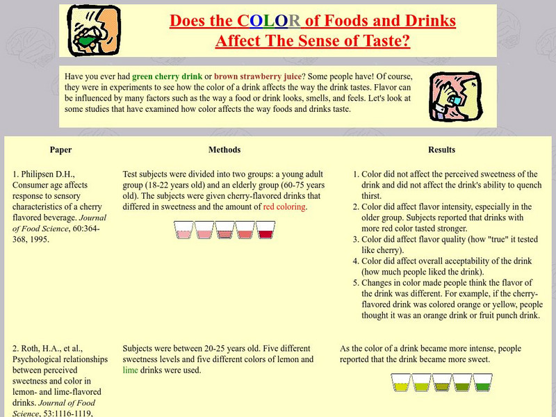 "Does the color of foods and drinks affect their taste?" Find the answer to this question and many more by checking out this website. The site gives a detailed description of several studies outlining the correlation between the color...