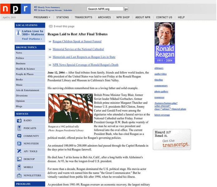 This article, from National Public Radio, not only documents the funeral ceremonies for former president Ronald Reagan (1911-2004 CE) but also provides a wonderful account of Reagan's life and presidency. Also included are audio clips of...