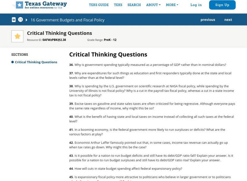 Texas Gateway: Ch. 16: Government Budgets: Critical Thinking Questions