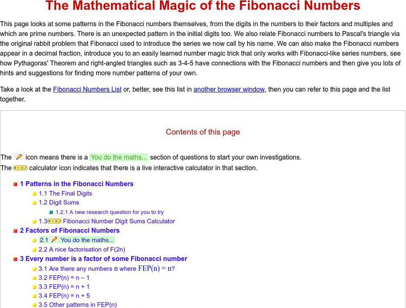 The mathematics behind Fibonacci numbers and the mathematics that comes as a result of them as well. Provides a lot of activities you can try using the Fibonacci sequence.
