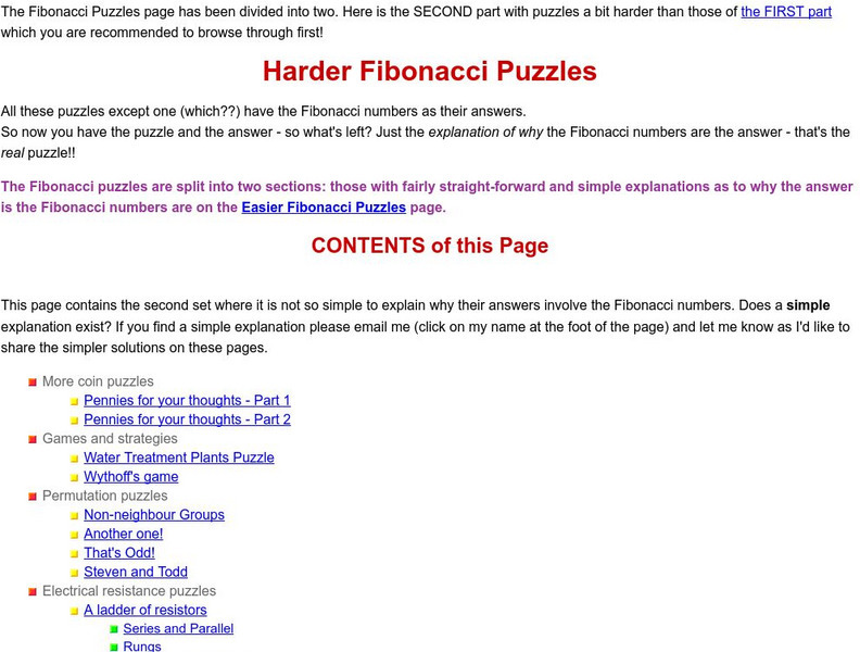 A list of difficult puzzles that deal with Fibonacci sequences and numbers. Especially interesting for students who enjoy puzzles and sequences.
