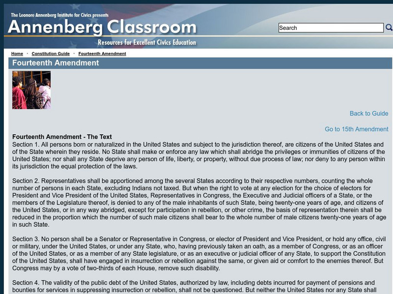 Text and brief description of the history and meaning of the 14th Amendment. Links to related resources listed.