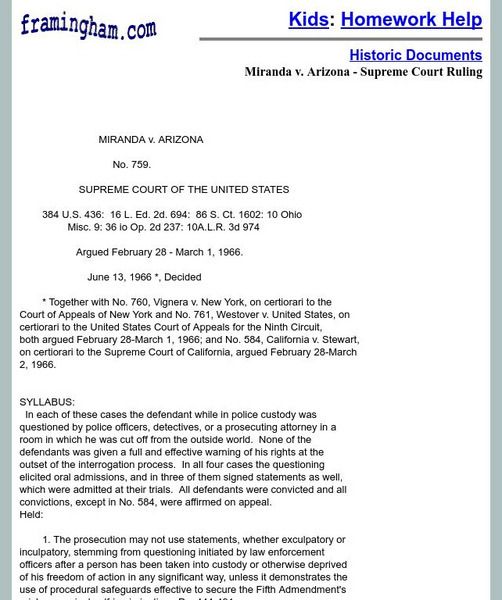Framingham Online: Info Pub: Historic Document: Miranda vs Arizona