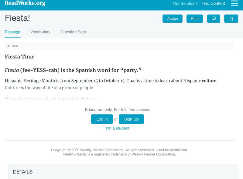 [Free Registration/Login Required] This passage explains the term "fiesta" to the readers. This passage is a stand-alone curricular piece that reinforces essential reading skills and strategies and establishes scaffolding for vocabulary...