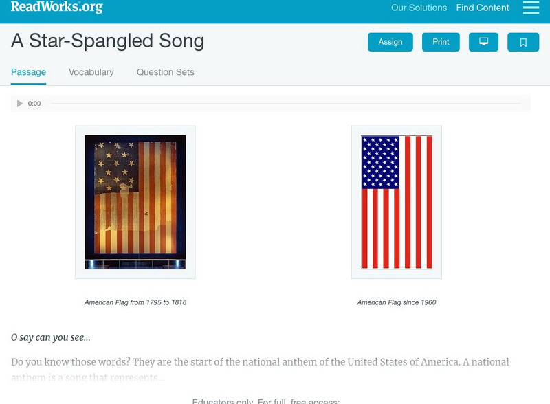 [Free Registration/Login Required] An informational text about the Star Spangled Banner. A question sheet is available to help students build skills in reading comprehension.