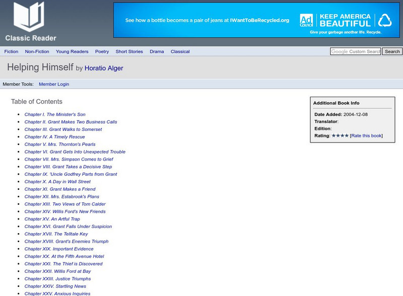 Classic Reader provides numerous classic works from famous authors. First published in 1886, one work is Helping Himself, or Grant Thornton's Ambition. This work was written by Horatio Alger.
