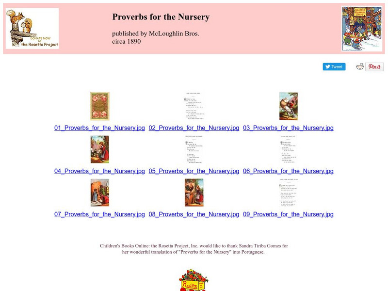 "Proverbs for the Nursery", published circa 1890 by McLoughlin Brothers , has been digitized and made available by the Rosetta Project. This 9 page book is appropriate for pre-readers.